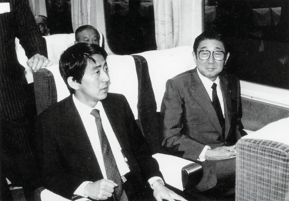 1982年11月,安倍晋三(左)与父亲安倍晋太郎(右)在一起。